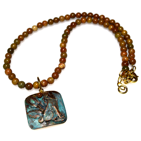 • 1 1/8" by 1 1/8" verdigris patina solid brass pendant with 4mm jasper or 6mm turquoise cabochon.