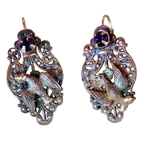 Olive Patina Brass Soaring Birds with Victorian Filigree Motif Earrings - Swarovski Crystals