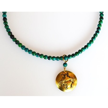 Antique Gold Brass Bee Necklace - Chrysocolla