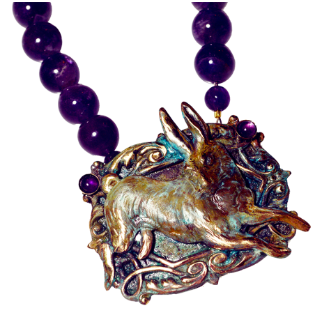 Olive Patina Rabbit Necklace Victorian Background - Amethyst
